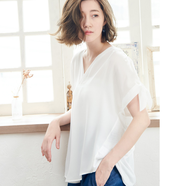 きちんと感を備えたVネックのプルオーバーブラウスです。フロントタックで立体感を出し、ボディラインを拾わないゆったりとしたシルエットに仕上げました。二の腕をしっかりと隠す袖は、リボンをあしらって女性らしさをプラス。シワになりにくいポリエステル素材でお手入れも簡単に行えます。洗濯又はクリーニングの際は、裏返してネットを使用して下さい。多少色落ちしますので、洗濯又はクリーニングの際、淡色のものとは別にお洗い下さい。淡色製品の場合は、蛍光増白剤の含まれていない洗剤を使用して下さい。洗濯後は脱水してすぐに干して下さい。濡れたまま放置しますと色泣きや他の衣類などに色移りすることがあります。この製品は水洗いで多少縮みます。水洗い後の乾燥機のご使用は避け、自然乾燥して下さい。クリーニング後の乾燥は、静止乾燥機の使用をお勧めします。着用による摩擦で組み合わせの衣服や他のものなどに色移りすることがあります。白や淡い色とのコーディネートする際は、十分ご注意下さい。この製品は着用中の摩擦や洗濯、クリーニングにより毛羽立ち・ピリング(毛玉)が生じることがあります。着用後はブラシで毛並を整え、出来てしまった毛玉は糸を傷つけないように小バサミや毛玉取り器などで除去して下さい。強い日光や照明に長時間当たりますと、変色する場合があります。光の当たる場所に放置せず、暗所で保管するようお願いします。この製品は大変デリケートな生地を使用しています。突起物やアクセサリーなどで生地を引っ掛けないようにご注意下さい。 ∞-∞-∞-∞-∞-∞-∞-∞-∞-∞-∞-∞-∞-∞-∞-∞-∞-∞-∞-∞-∞※サイズ表は、実物を採寸した実寸です。商品タグのサイズは、メーカー基準サイズとなりますので実寸とは異なります。∞-∞-∞-∞-∞-∞-∞-∞-∞-∞-∞-∞-∞-∞-∞-∞-∞-∞-∞-∞-∞ ロペピクニック/ROPE’ PICNIC Rope’Picnic|トップス|シャツ・ブラウス