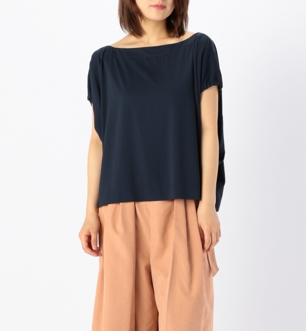 ?トレンドを気にせずにデザイントップスを取り入れる?袖にシャーリングを施したブラウスは、紐を通してギャザーを調整出来る様にしています。表情感のある生地なのでサラッとした肌辺りでこれからの季節に嬉しいアイテムですが、シンプルなので羽織と合わせながら秋口にも着用できます。袖にデザインを施したトップスがトレンドですが、シャーリングはフレアスリーブやバルーンスリーブとは違った印象になります。トレンド過ぎないので流行を気にせずオシャレなスタイリングが仕上がります。クルーネックやVネックが多い中でボートネックの首元も新鮮に映ります。 アルカリ/alcali nota della mano sinistra|トップス|シャツ・ブラウス