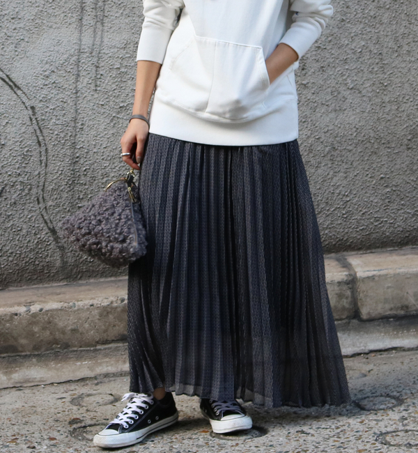 控えめな千鳥柄が大人な印象に仕上げてくれるプリーツスカート。 細かいプリーツなので、ボリュームが出すぎずすっきりと着こなせます。 長めの着丈がこなれ感を演出。 軽い印象の素材なので、ニットなどとの相性も◎ スニーカーやスエットなどでカジュアルダウンした着こなしもおすすめです。 カプリシュ レマージュ/CAPRICIEUX LE’MAGE スカート|スカート