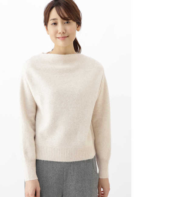 ボートネックのプルオーバーです。身頃の天竺を横使いにしています。衿端は編み地のミミ使いをしているのですっきりしています。今年のフォックスウールはカラーでも見せています。ナチュラルベージュとスモークグリーンどちらもトップの良い風合いが出ていてしかも軽いのが特徴です。 ヒューマンウーマン/HUMAN WOMAN トップス|ニット・セーター