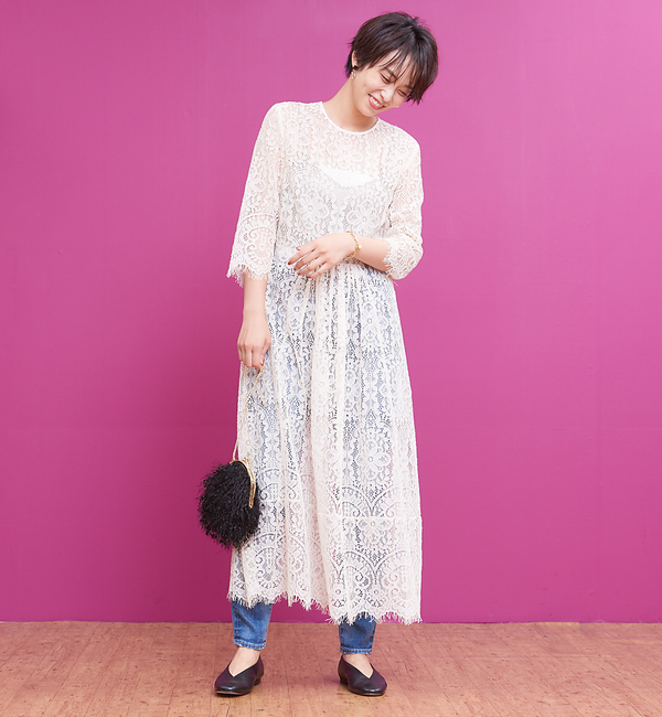 繊細な総レースを使ったロング丈のワンピース。今年トレンドのパンツやレギンスとのレイヤードスタイルを意識しているので、あえて裾部分には裏地をつけていません。その分透け感や軽やかさを楽しんでいただけます。身頃は前側だけキャミソールがついているので合わせやすさも。コートを羽織ったときにも裾からレースがのぞくように、スカート丈は長めです。デイリースタイルを格上げしてくれるアイテムとして、是非手に入れたい一着です。model:H166 B80 W59 H86 着用サイズ:FREE ルージュ・ヴィフ ラクレ/Rouge vif la cle Rouge vif|ワンピース|ワンピース