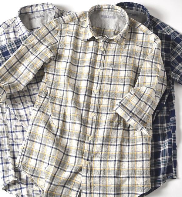 綿麻混紡のトップ糸使いの7分袖シャツ綿麻混紡素材で取り扱いしやすく、着やすい素材感とトップチェック柄がきれいな7分袖シャツ。シンプルになりがちな夏のコーディネートのアクセントになる事とベーシックなサイズ感ですので幅広いスタイリングでお使いいただけます。今期らしく、前開きでカットソーと合わせてラフな雰囲気がおすすめです。 シップス/SHIPS SHIPS|トップス|シャツ・ブラウス